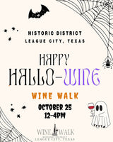 Join us for a howling good time at our Hallo-Wine Walk in Historic League City, Texas. Savor a variety of wines, specialty drinks and treats while enjoying exclusive deals and discounts exclusive to Wine Walk participants.