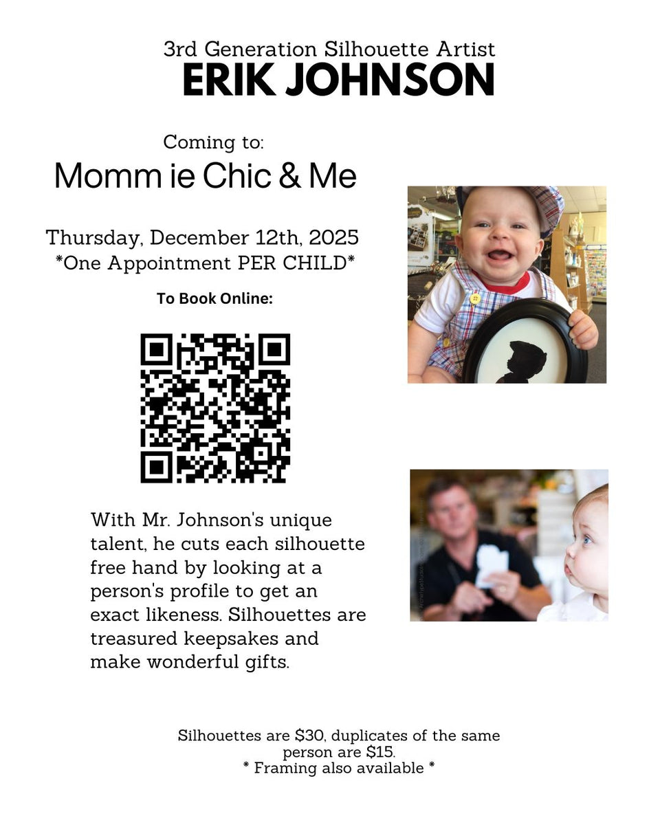 Erik Johnson, a third generation silhouette artist is visiting Mommie Chic & Me on December 12th. It only takes five minutes and you will be left with an heirloom quality portrait you will cherish for a lifetime. They also make fabulous Christmas Gifts. Sign-ups are now open, you can follow the link below.