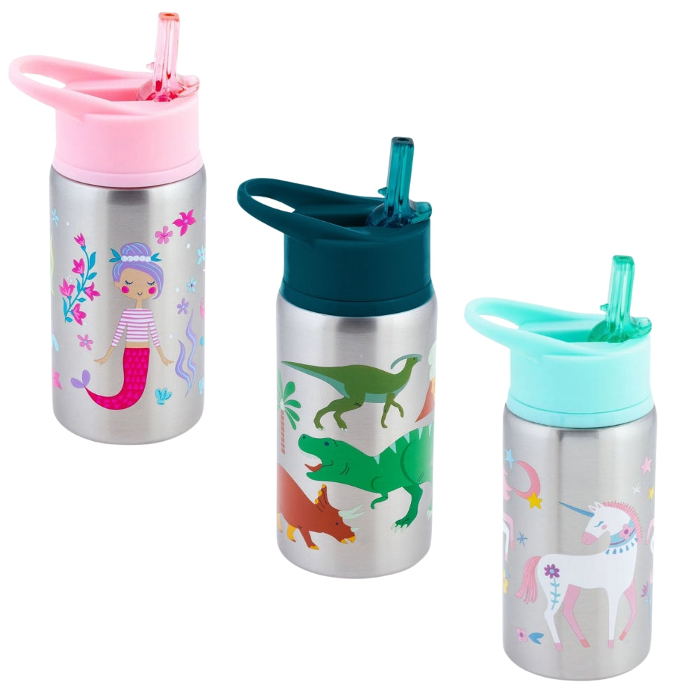 These Stainless Steel Water Bottles hold up to 18 ounces of liquid, feature a flip top spout to prevent leaks when closed and include an easy-to-hold carrying loop.