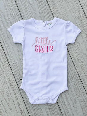 "Little Sister" White & Pink Embroidered Footie - 3 MONTH ONLY