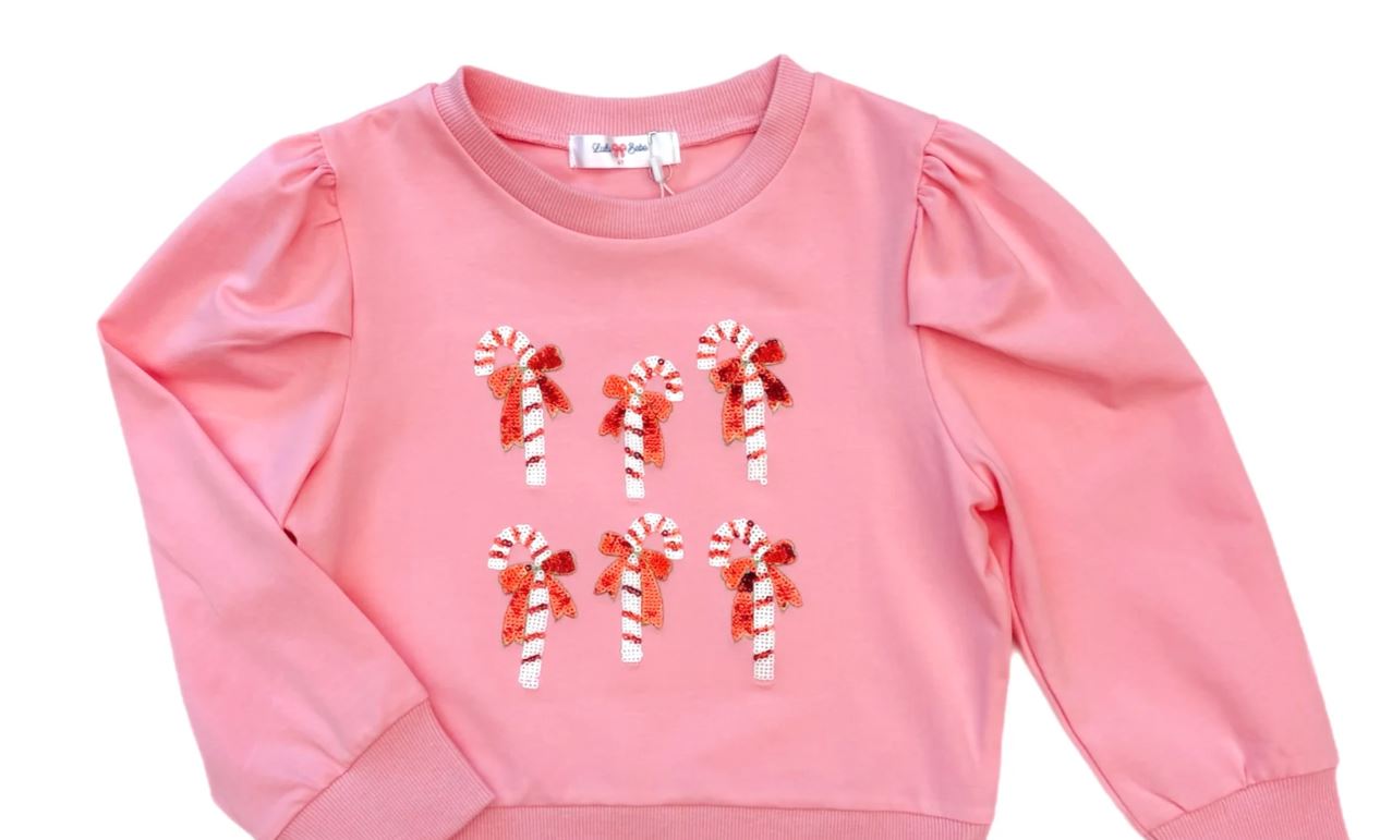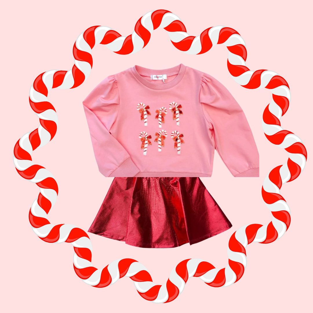 Get ready for the holiday season with this adorable two piece set. Pink sweatshirt with sequin candy cane Red White Candy Cane Puff Long Sleeve Pink Shirt! A fun top perfect for all the Christmas festivities. Long-sleeve shirt is 95% Cotton/5% Spandex. Sequin appliqued is lined to keep comfortable. Red metallic skort has elastic waistband, white shorts built in (even with a hidden pocket) and twirls! Poly/spandex blend.