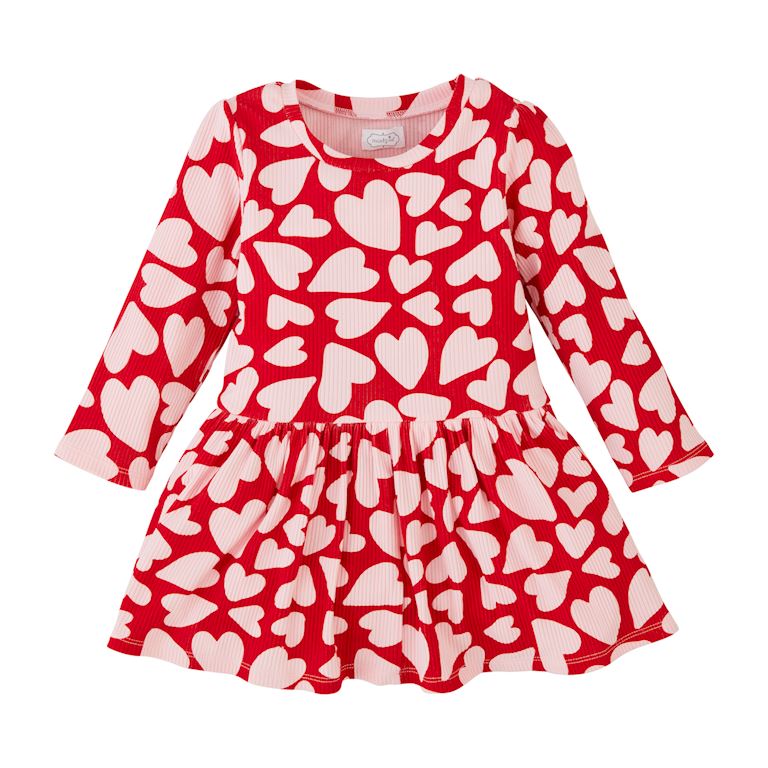 Cotton Knit Dress with an all-over heart print. Red dress with pink hearts printed on it. Comfortable and cozy cotton rib knit fabric.
