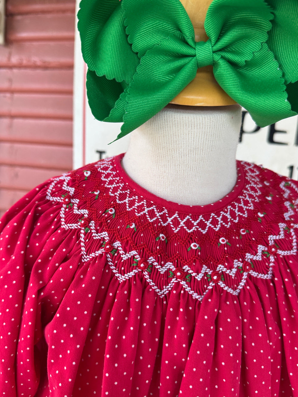A classic and traditional picture-smocked dress that is simply timeless. Perfect for family photos and meeting Santa Claus! This Christmas smocked dress is made with a red & white polka dot fabric with smocked dainty flowers that is truly exquisite. Coordinating little brother and sister bubbles also available. Looking for a gift? Holly Holiday looks cute with her.
