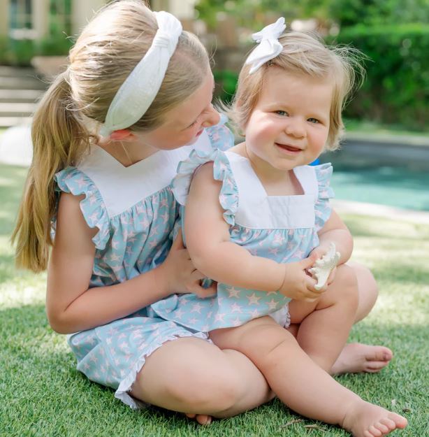 The Caroline Dress by Lila & Hayes. Pima cotton flutter sleeve dress with woven square panel neckline and white woven ruffle at the hem. Coordinates with the Annie Girls Bloomer Set.