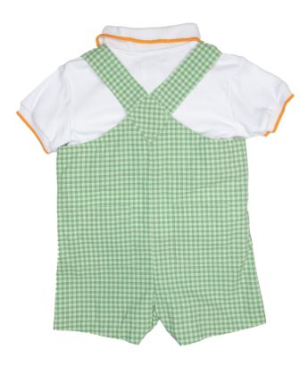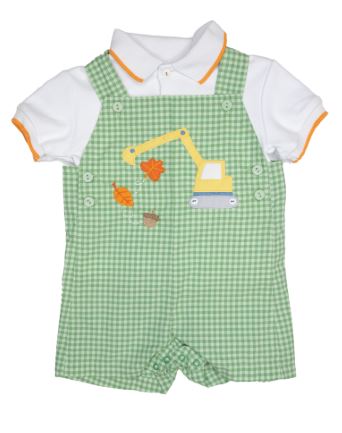 This Green Gingham overall set with a collared shirt is a favorite for your little guy - features an applique crane and fall leaves!