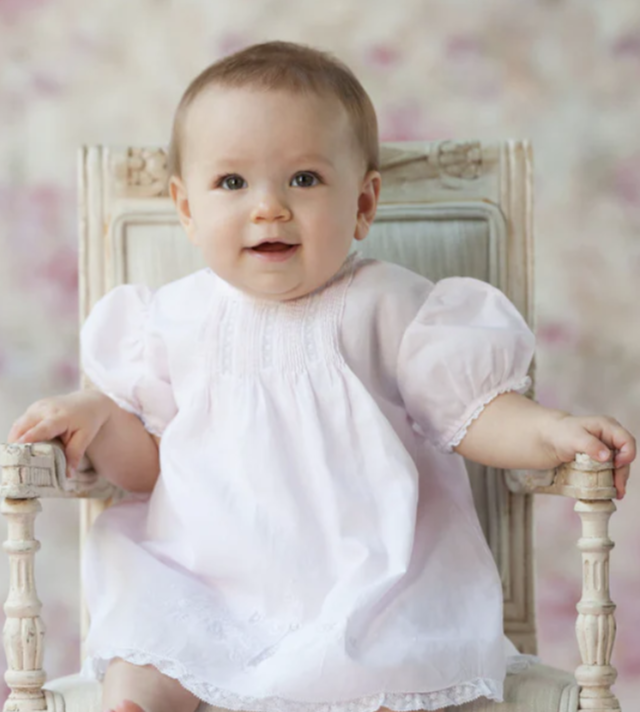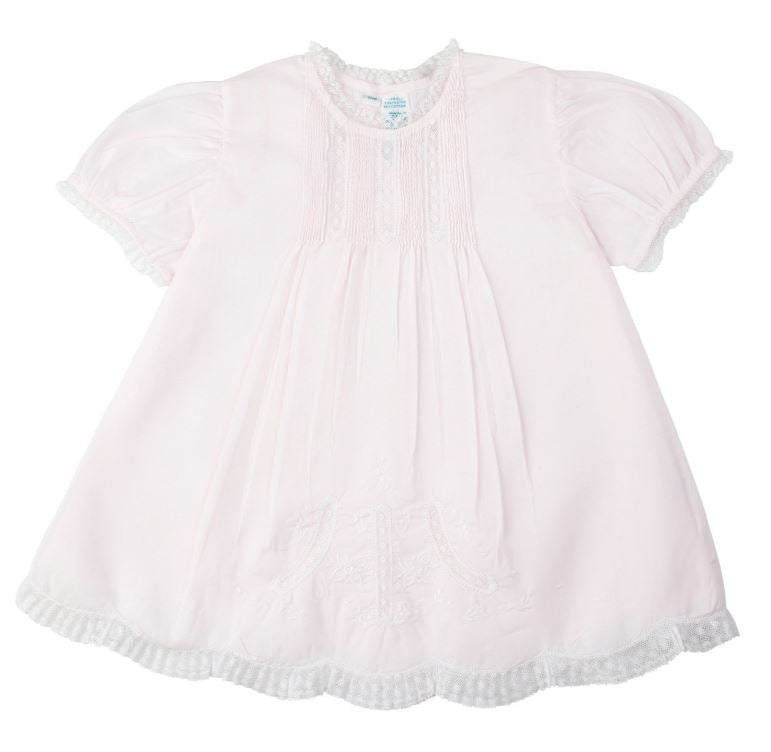 An exceptionally beautiful slip dress, designed with your little girl in mind! This vintage style dress come in soft white and pink colors with fluted lace trim at the neck, cuffs, and hem. The front features classy lace inlays and pintucks on top, as well as lace inlays and intricate floral embroidery gracing the bottom. A breathtaking slip dress for your loved one, in a traditional, heirloom style that transcends generations!