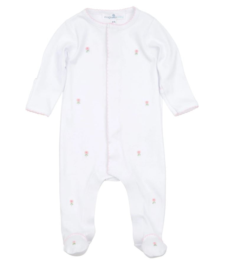 Add a touch of elegance to your baby's wardrobe with the Juliette’s Classics Scattered Footie. This footie features hand-embroidered floral details scattered across the fabric, all on the softest 100% Pima cotton. Designed for both comfort and style, this piece is perfect for everyday wear or special occasions. A lovely choice for a baby shower gift or a take-me-home outfit.