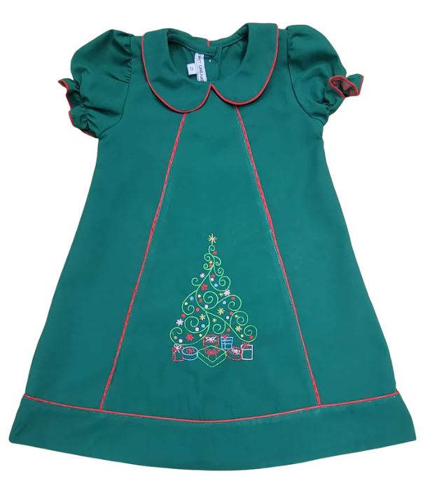 The Christmas Tree Embroidered Hunter Green Dress will dress up any holiday event.  Trimmed in red. Tree has gorgeous gold accents.