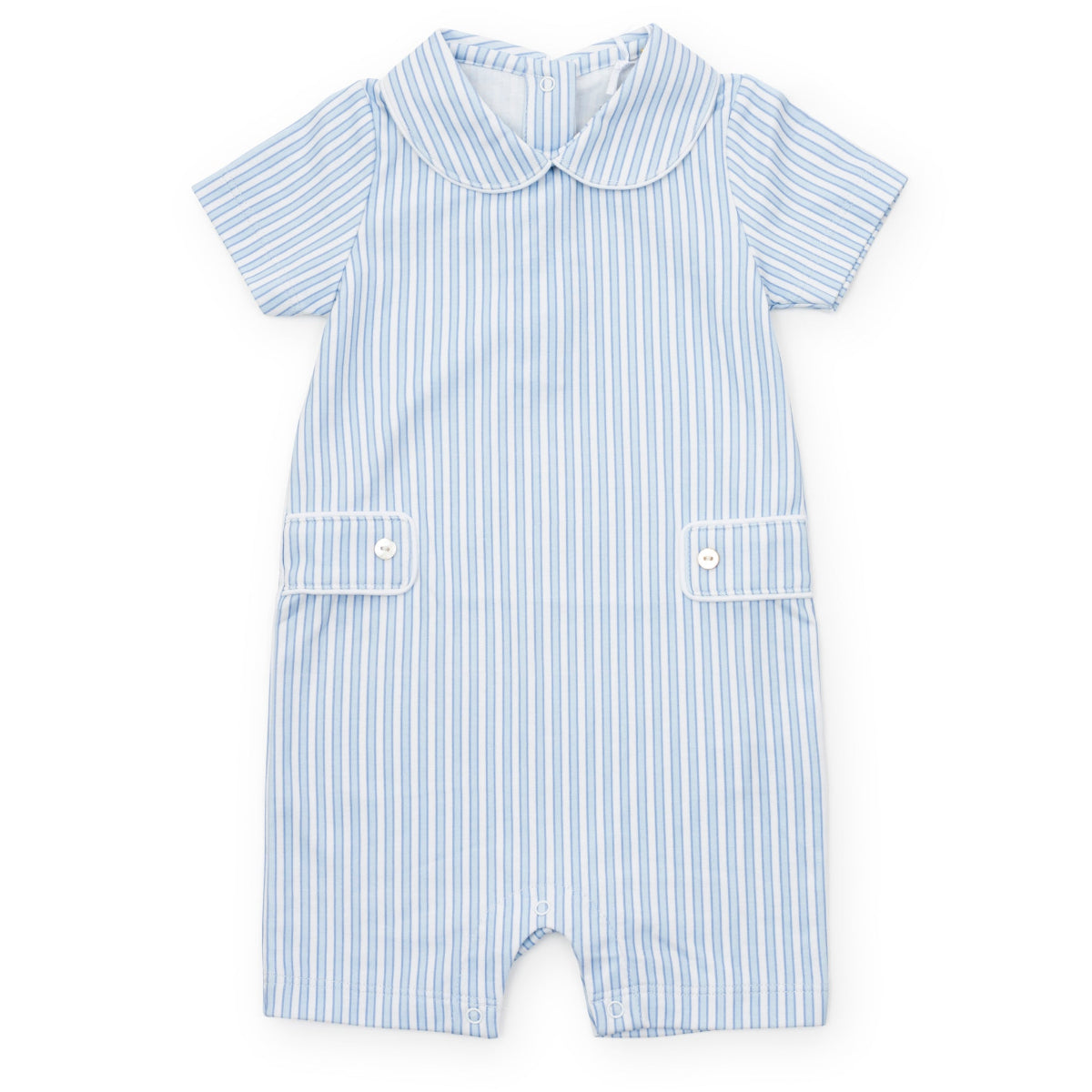 Boys' pima cotton shortall with contrast stitching on collar and side plackets. Snaps in stride and back of neck.
