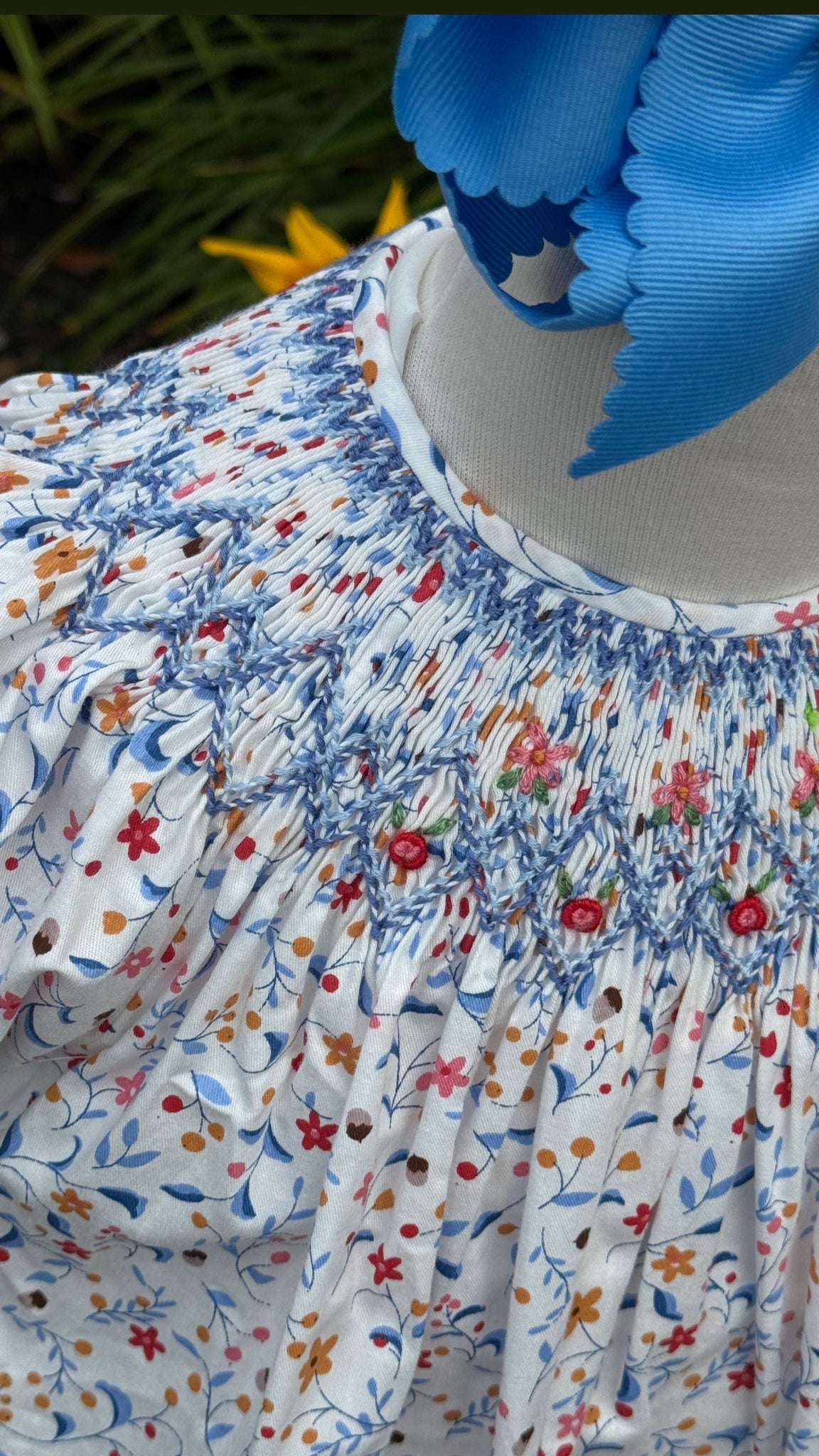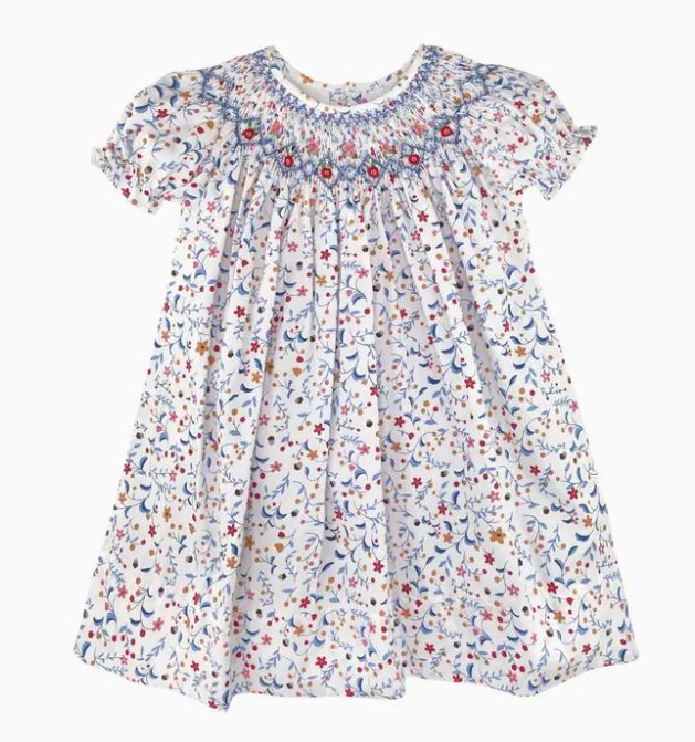 This short-sleeve Petit Ami dress comes in a beautiful fall floral print fabric with hand bishop smocking and embroidered details. Bishop Style dress, buttons in the back. All over fall print. Perfect with Wee One's Copenhagen Blue Bow (COP).
