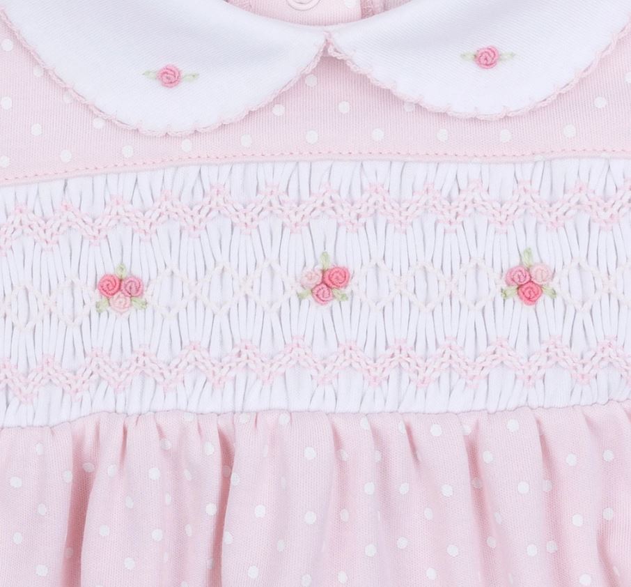 Wrap your little one in timeless elegance with our Mia's Classics Smocked Long Sleeve Bubble - Pink. Inspired by a traditional children's layette, this luxurious Pima Cotton one-piece combines classic style with comfortable long sleeves, featuring delicate hand-embroidered smocked roses.