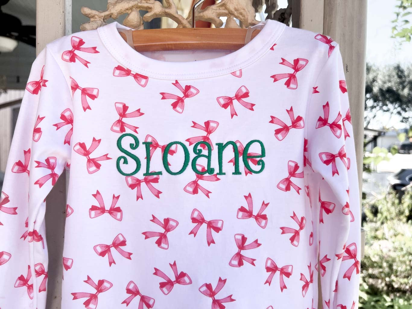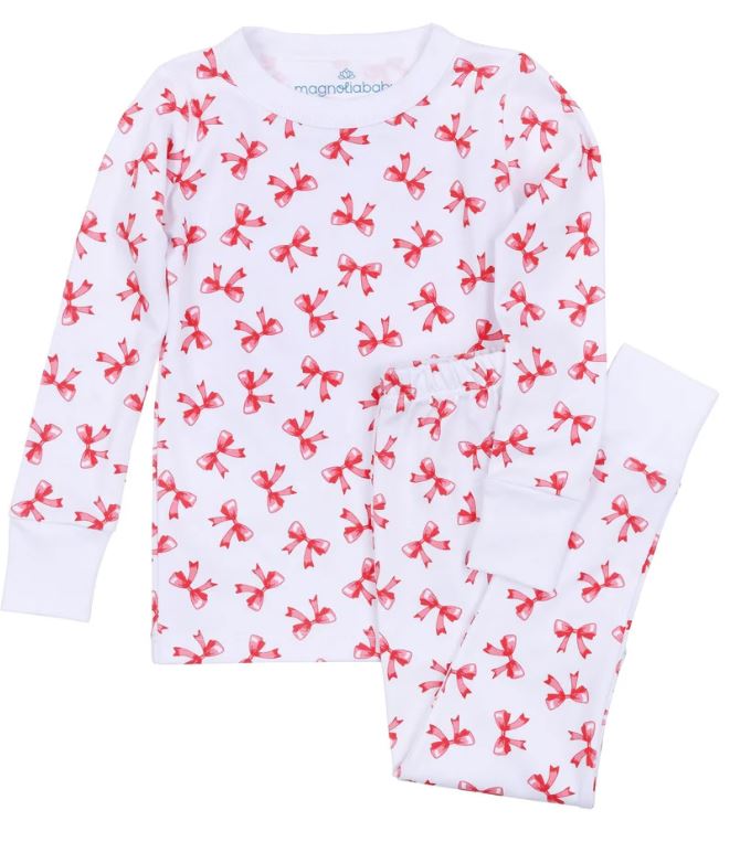 Get ready for cozy nights with these festive long pajamas in luxurious white Pima Cotton. This two-piece set features a whimsical all-over bows print. The red picot trim on the collar and cuffs adds a touch of classic sweetness.