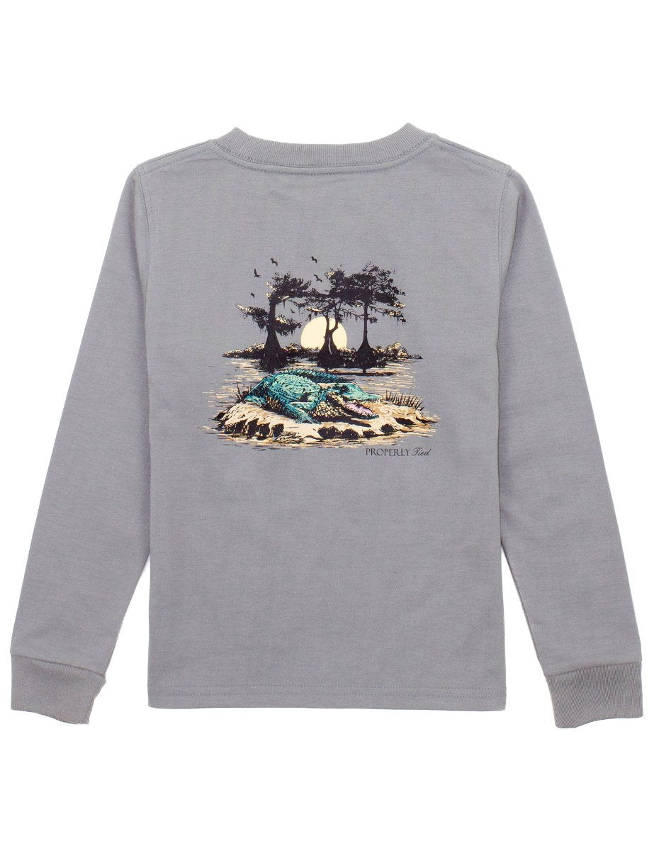 Boy's Bayou Gator LS Battleship Grey T-Shirt by Properly Tied. Mom's will love the versatility of this T-Shirt and the guys will love how soft and comfortable it is. Halloween, Fall, Mardi Gras any given day! Great shirt to wear.