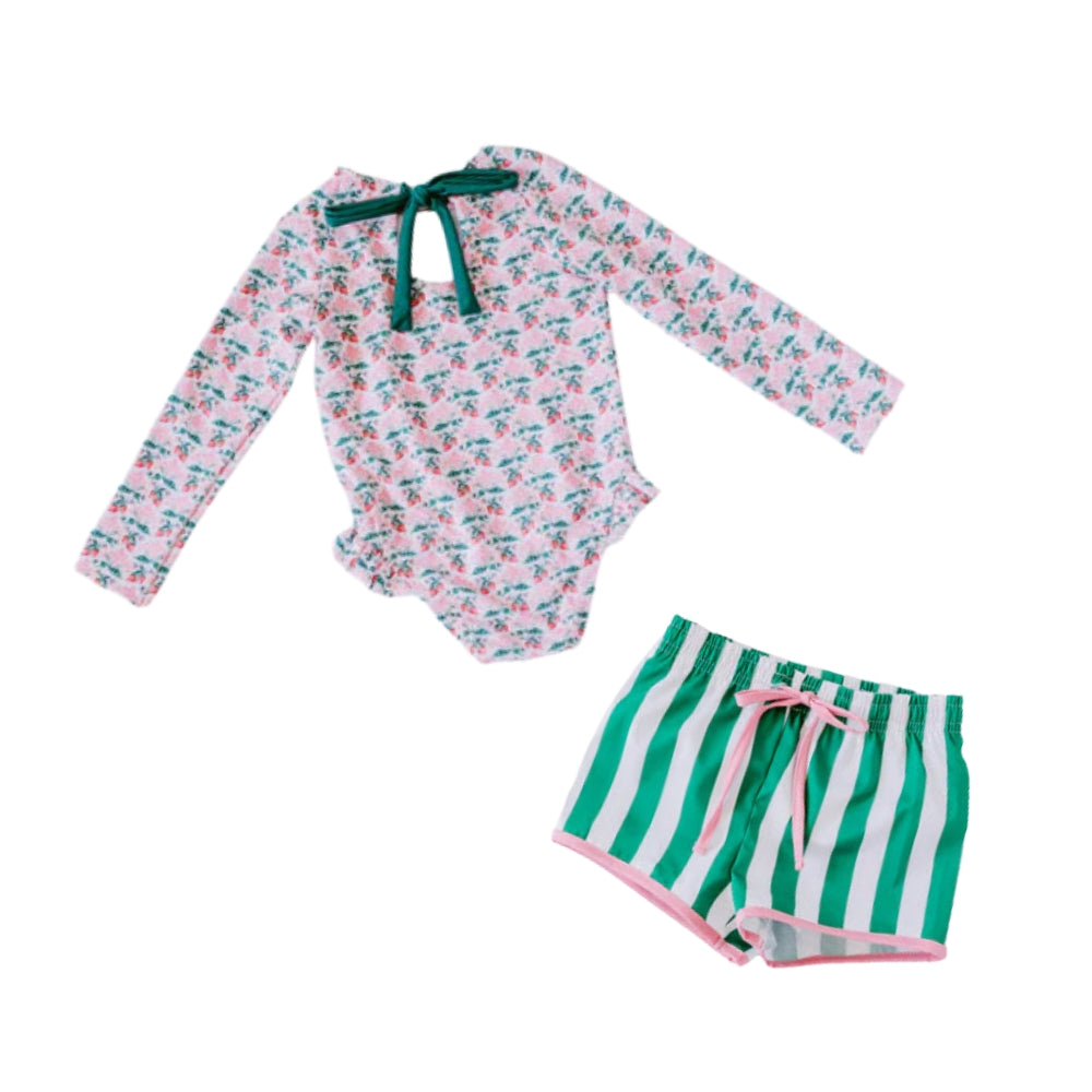 She will be ready for the pool or beach in this adorable Strawberry Swimsuit and matching Cabana Shorts!