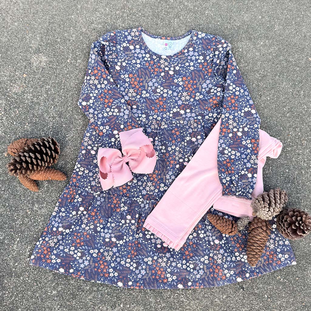 One of the cutest fall outfits of the season. This Navy Floral Tiered Tunic comes with a pretty blush pink leggings. Tiered Tunic Top has a navy background with rust, blush pink, white, and grey floral print. Blush Pink leggings have a tiny ruffle accent trim on the cuff and an elastic waistband. 95% Cotton/5% Spandex.