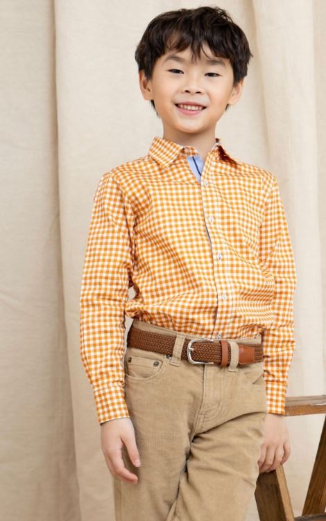 Orange Gingham long sleeve shirt from Tuk Tuk. Signature TukTuk Designs shirts complete with contrast fabric and ribbon detail around the collar and placket. Little shirts that are big on style!