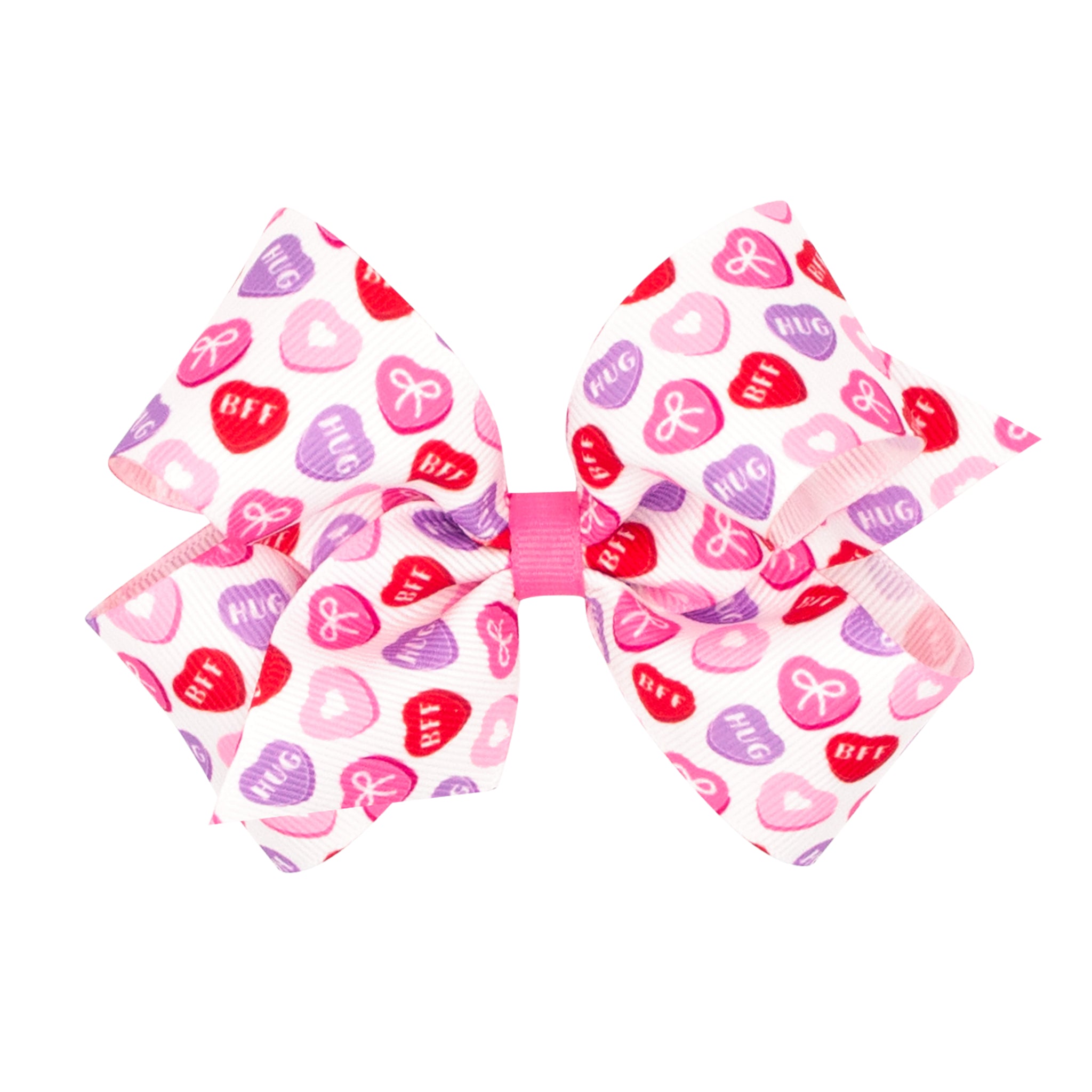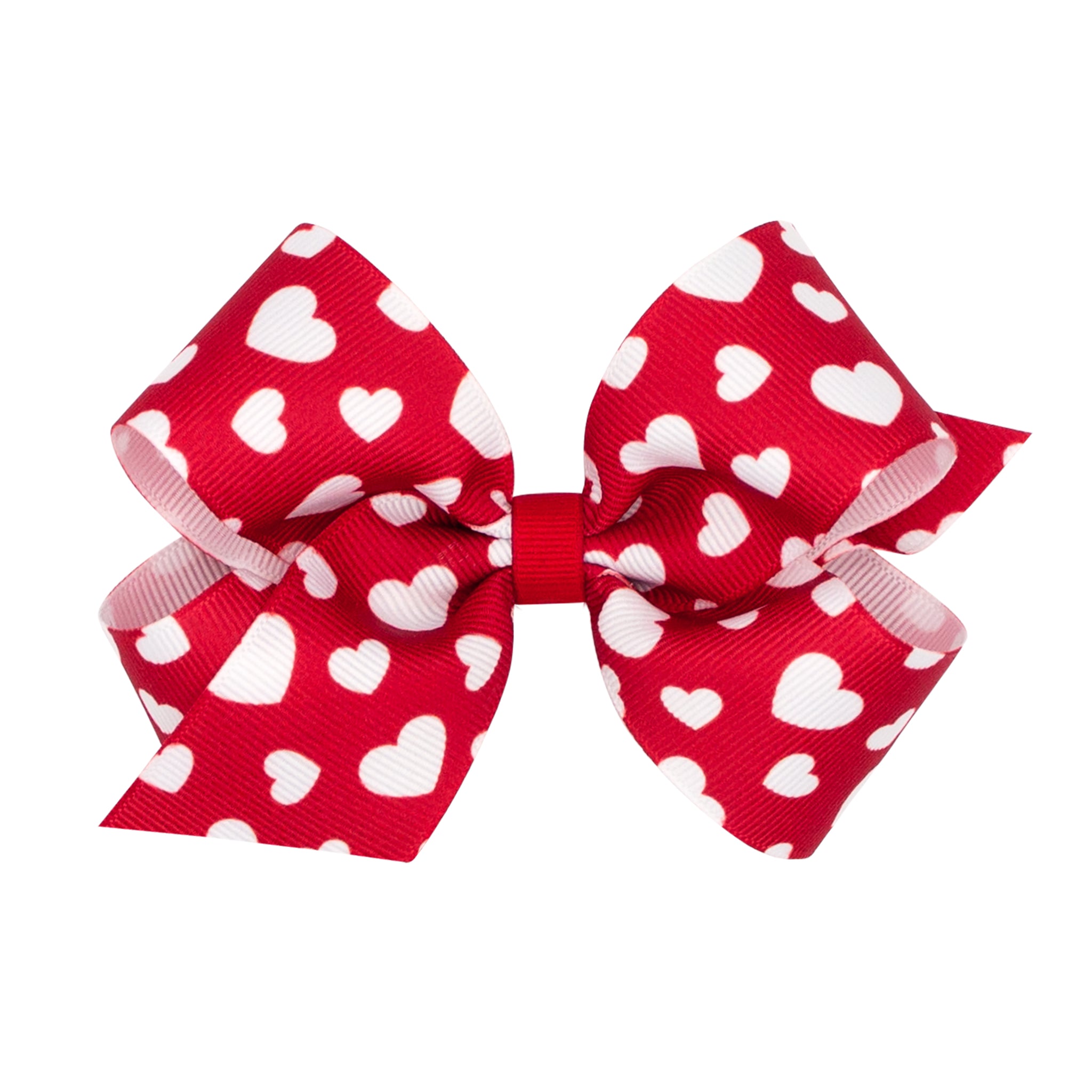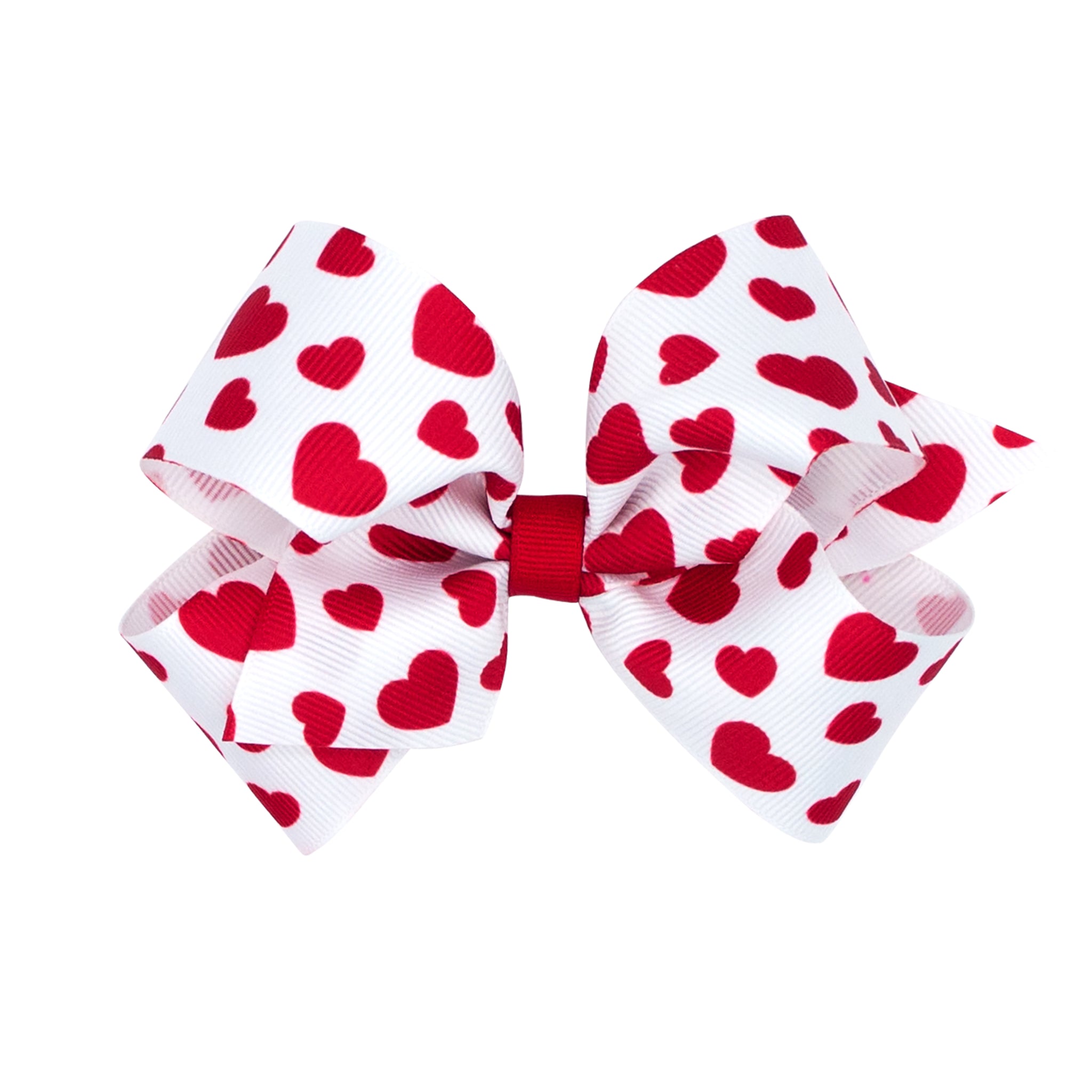 This Wee One's Valentine's bow features a classic heart print on our favorite Grosgrain ribbon, perfect for any sweet-as-candy look! Add a touch of heart and style with our thoughtfully handmade bows for the season. This Medium bow is sure to stay in her hair all day with Wee One's patented WeeStay™ no-slip hair clip.