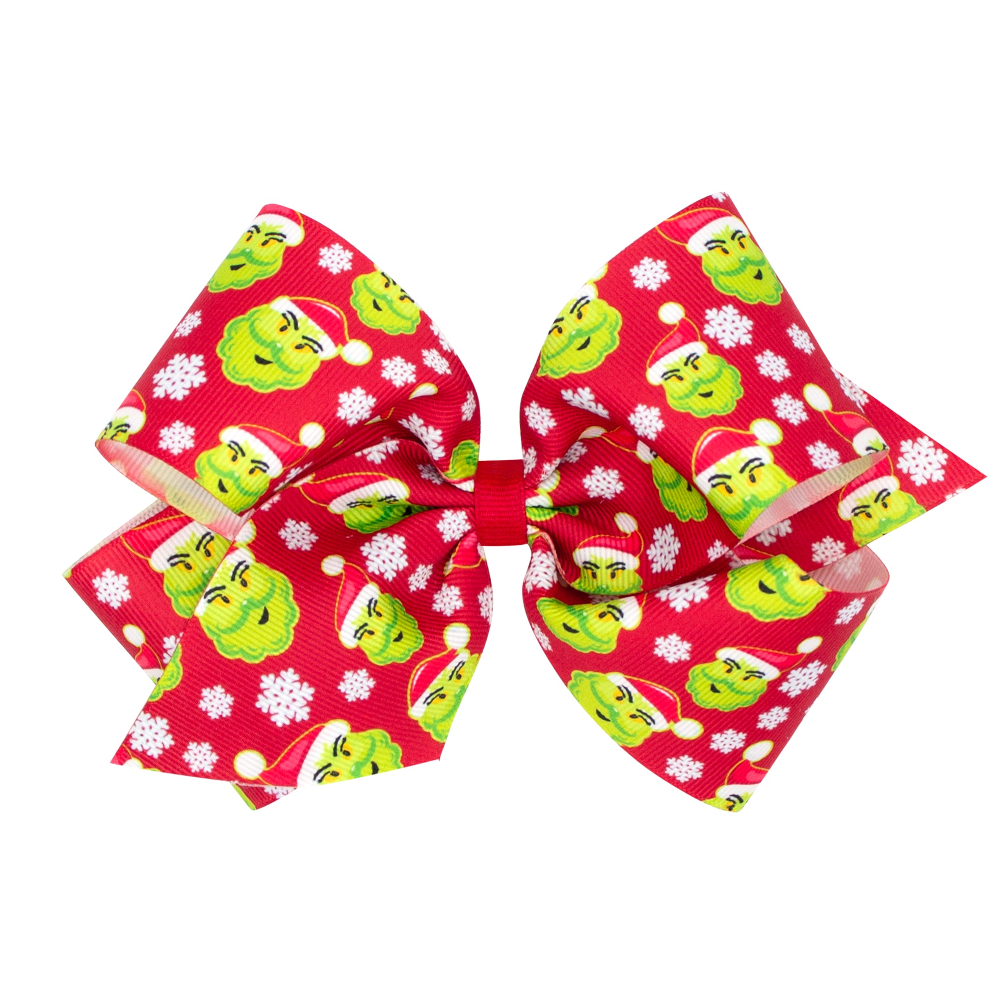 The Grinch Hair Bow! Perfect for a Grinch Day at school! Red grosgrain with all over grinch face and snowflake print. Available in King or Medium.