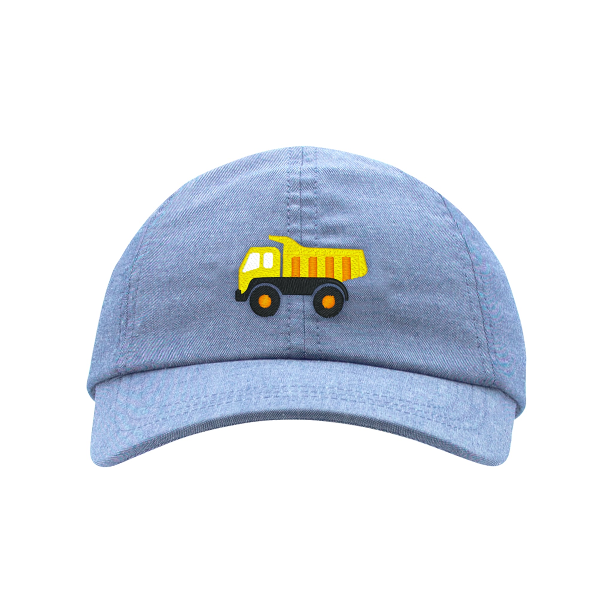 This boy's Denim Chambray ball cap features a colorful embroidered dump truck. Wee Stitch design from Wee One's Bows. Keep your little one looking cool and stylish with this fun-loving accessory.