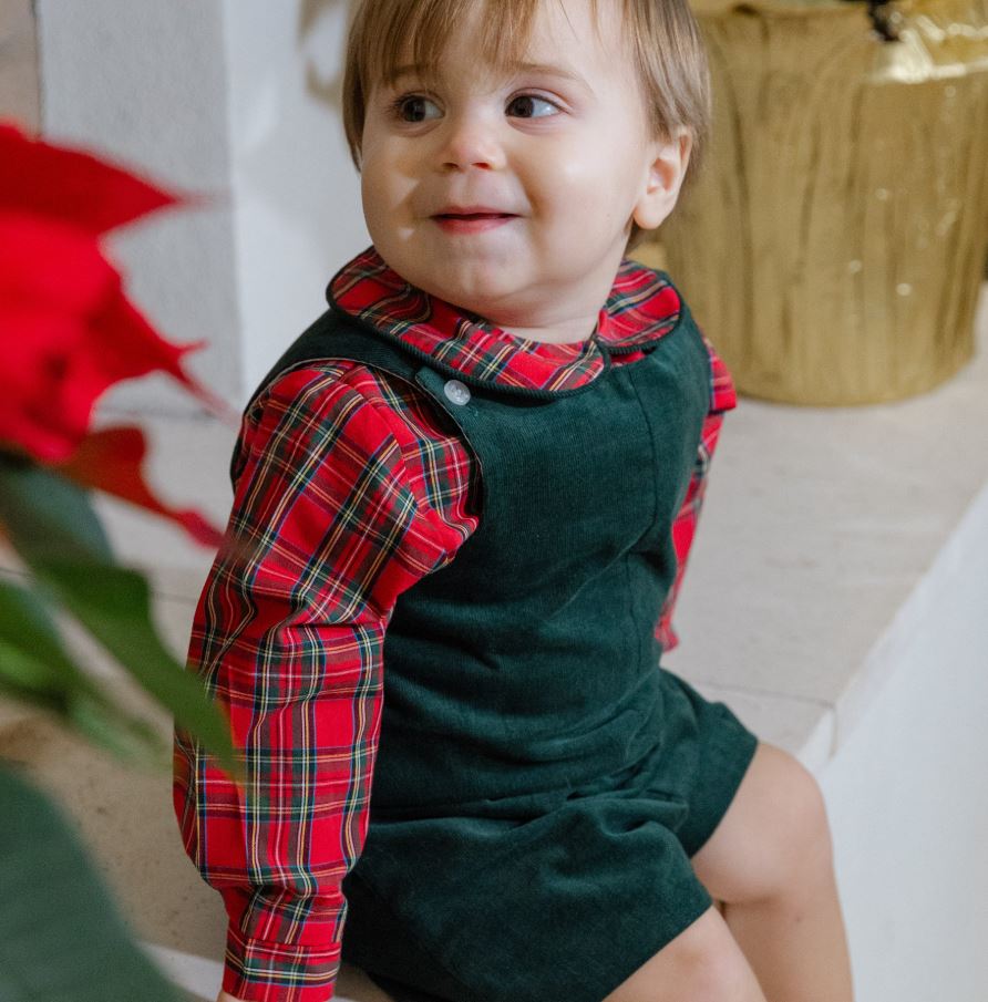 The perfect outfit to celebrate their first holidays, this classic John John has plenty of details to make them stand out. Made in forest green corduroy, the elegant side tabs with contrasting buttons add a timeless touch to this family heirloom.